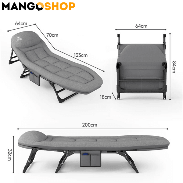 Krevet ima 3-u-1 bočni džep za lako skladištenje stvari i podignuti jastuk za podršku glavi i vratu. Lako se montira i transportuje, savršen za kampovanje, planinarenje, plažu, ili kao dodatni ležaj kod kuće.